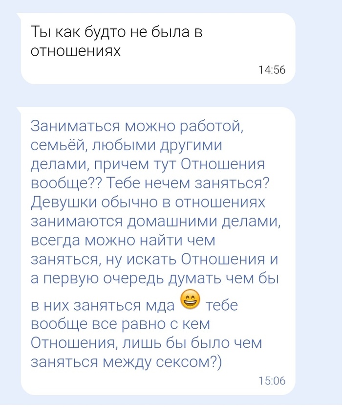 В комментариях мне написали несколько человек, что мне на сз писали тысячи человек, а я только одного придурка смогла выбрать среди огромного количества наверняка нормальных парней. И меня триггернуло и вылилось в этот поток, извините)