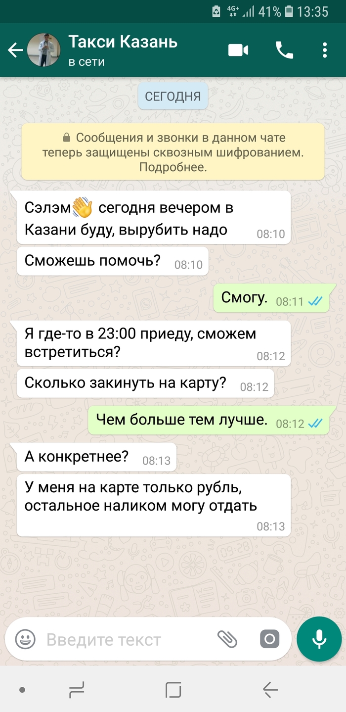 Собрались с супругой в Европу. Сентябрь 2019 года. Плана не было, что увидим, где побываем, где заночуем... взяли билеты на самолет до Аликанте из Казани, а там уж куда приведет кривая европейской демократии))). Но буквально на следующий день увидел по новостям, что в Аликанте прошелся ураган с ливнем вроде 200 литров выпало осадков на 1 метр квадратный. Я несколько стал переживать, после просмотров видосов что там творилось... Но билеты уже куплены. Решили поездку не переносить. Вылет рано утром через 1 день. До Казани решил ехать на такси. Заехал на автостанцию, там все бомбилы собираются. У них дешевле в итоге выходит, чем через тот же яндекс или ди-ди. Приехал, договорился. Обменялись телефонами с таксистом. На следующее утро состоялась переписка с этим таксистом. Я вообще не понял как вообще такое случилось. Он мне писал, как своему знакомому, он совсем тупой как пробка? Но я виду не подал, хотел выяснить, что он в итоге хочет. Потом ему перезвонил с вопросом "что это нахрен было?" Были какие-то невнятные отмазки, что я не так понял, бла-бла-бла. По хорошему конечно надо было на него в полицию накатать, но время поджимало, вечером выезжать, да и знакомый бывший полиционер сказал, что этого недостаточо, что бы органы возбудились. Аккуратнее с таксистами. Могут отпуск испортить.