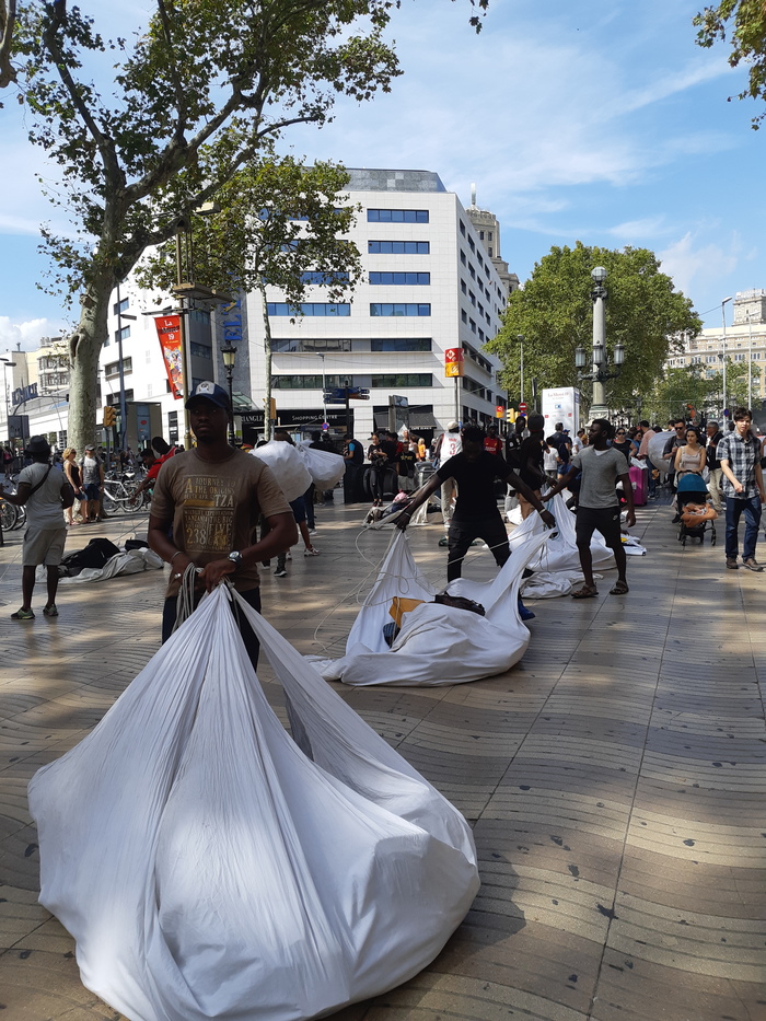 А это торговцы всякого барахла. Раскладывают товар на простыне, а завидев полицию, сворачивают в котомку и бегут до другого места.