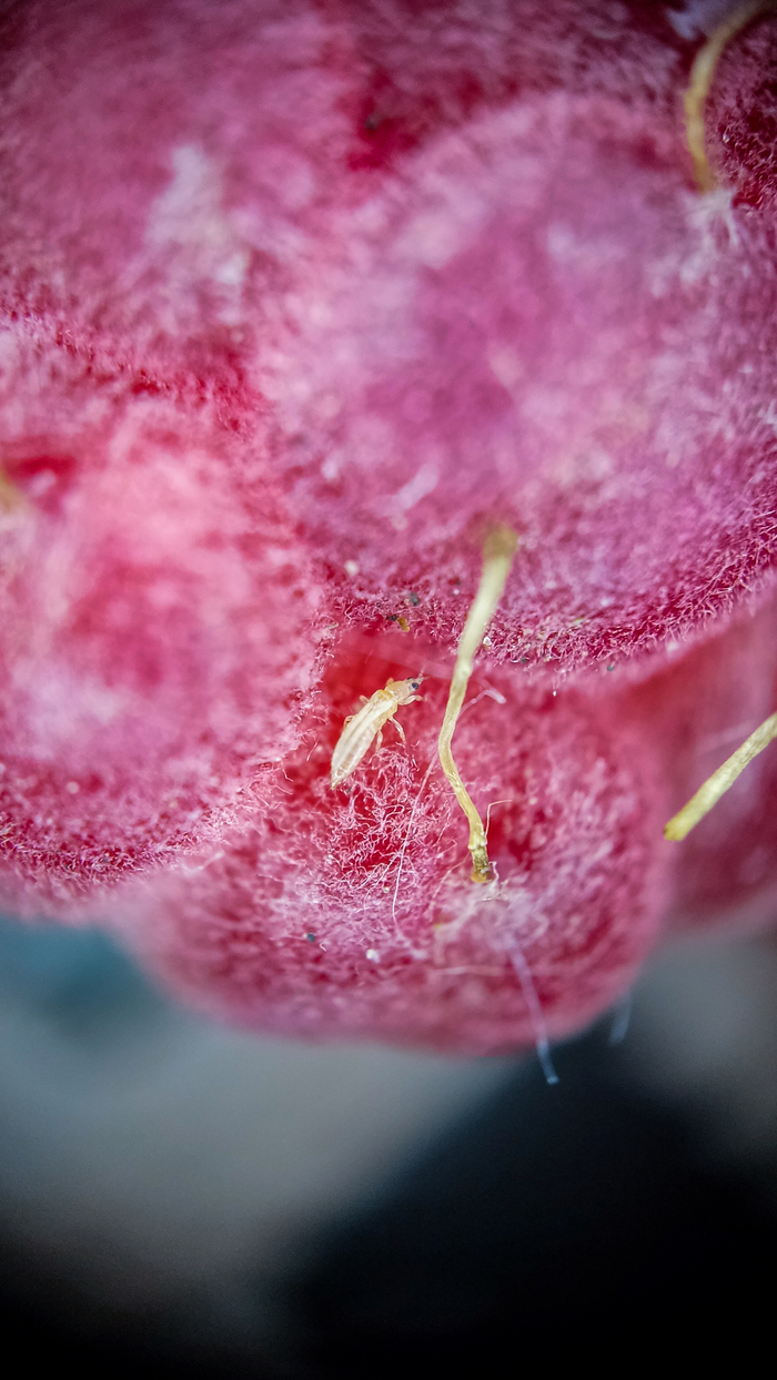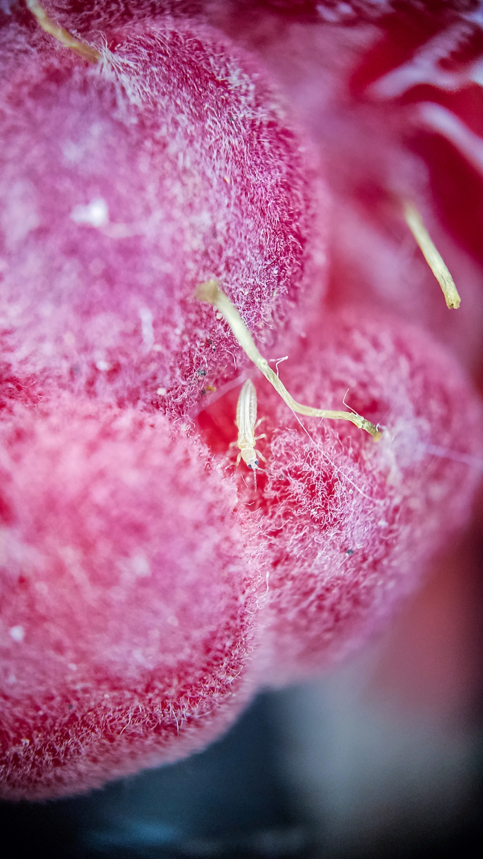 Некоторое время назад, в комментариях на Пикабу к моему посту про клубнику, одна пикабушница @Mawritanka, написала: "и никаких жучков?! а то как не выставят фото под микроскопом то прям одна живность. Спасибо Вам в общем. Ещё малину без живности пожалуйста". И каково же было мое удивление, что на той самой малинке, которую я взял фотографировать, сразу оказался жучек. Невооруженным глазом его было совсем не видно, только когда он начинал бегать по чистой крупинке малины была едва различимая точка, но под увеличением, жучке показал себя с разных сторон. Так что это пост больше не про красную мохнатенькую сладкую малинку, а про её гостя. Известное дело, что малину сложно мыть, но тут 2 пути. Либо мыть, либо если что то хрустит когда ешь малину, то это проблемы того, кто хрустит.