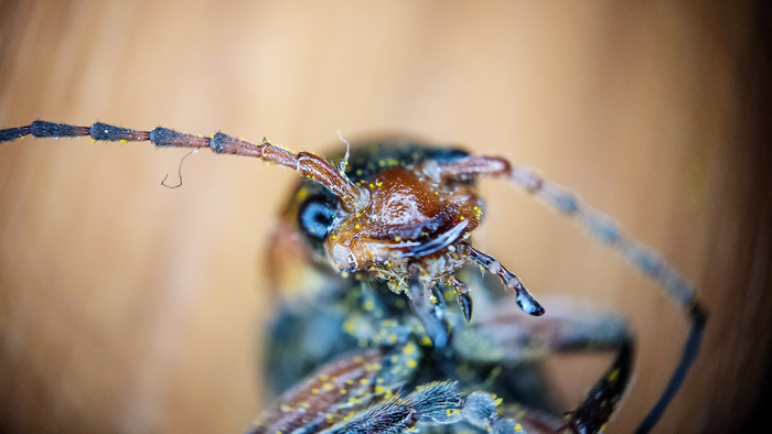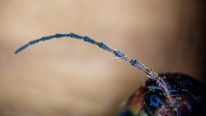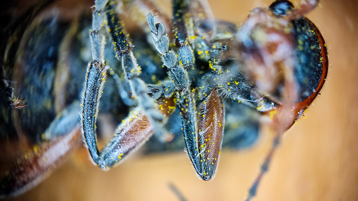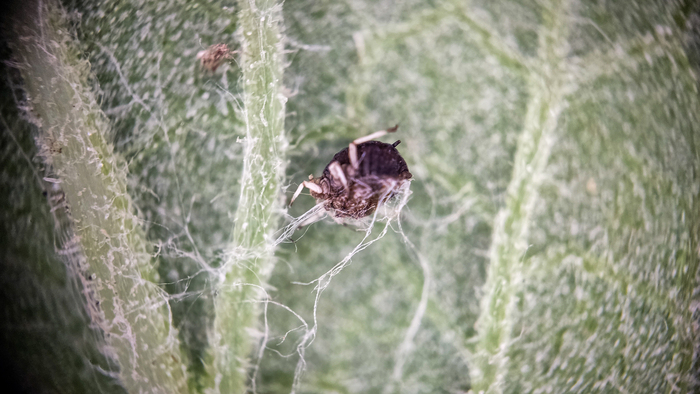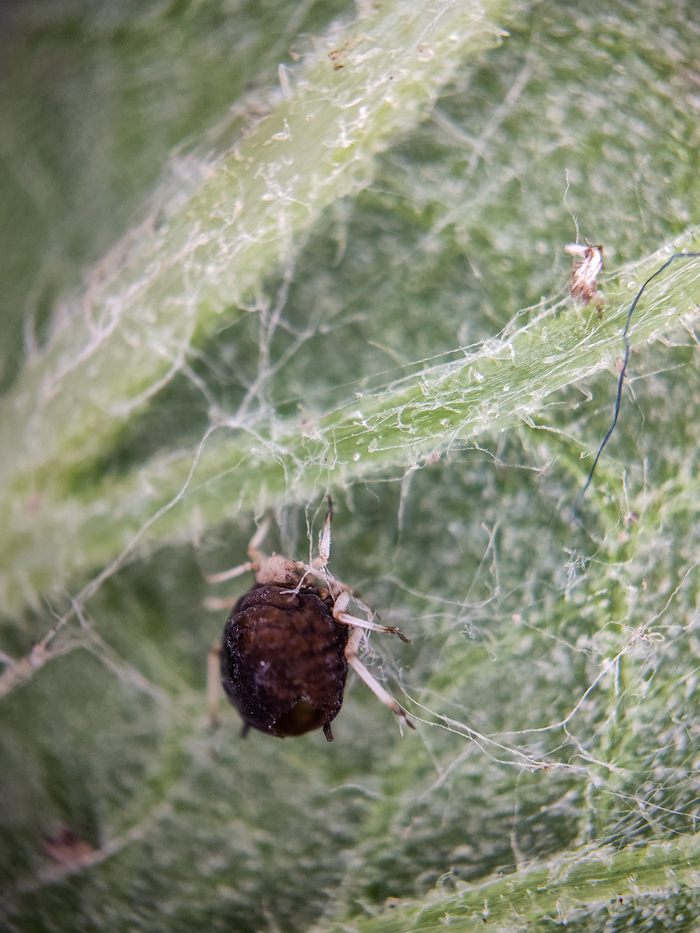 Когда я решил посмотреть поближе на репей, я планировал, что расскажу вам историю о том, как Жорж де Местраль в 1948 году снимал со своего пса репейники, решил рассмотреть их в микроскоп, увидел крючки, так к нему и пришла идея застежки липучки. Но природа как всегда удивила. Рассматривая листья репейника я решил подробнее рассмотреть черные точечки на изнанке листьев. И каково же было мое удивление, когда эти точки, оказались жуками, предположительно, паутинным клещём. Их там было много, Но они были смирные и фотографировать не мешали. Мерзость конечно та еще.