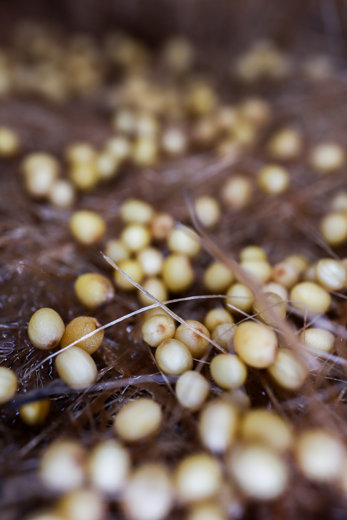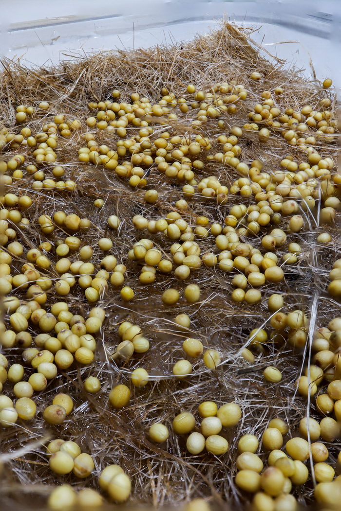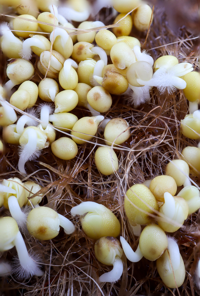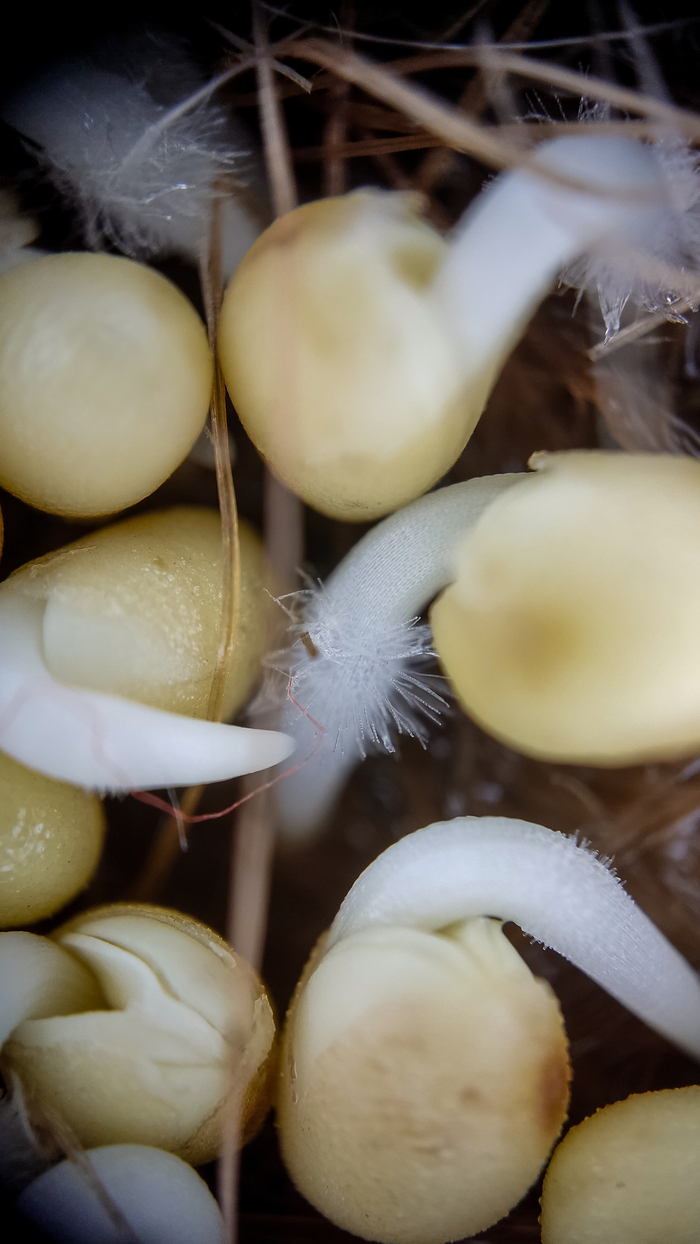Прошли сутки с того момента, как я посадил на микрозелень горчицу. Стояла она в шкафу на кухне, там как раз, сухо и темно, а для проращивания больше и не надо. Практически все семена проклюнулись и мы можем наблюдать белые, местами мохнатые корешки. В таких условиях им стоять еще 1 сутки и после этого я достану их на свет.