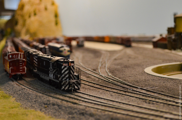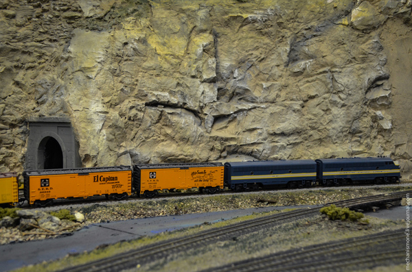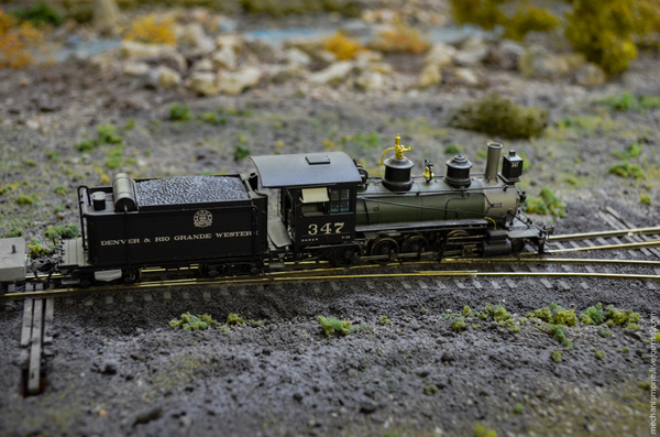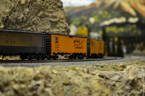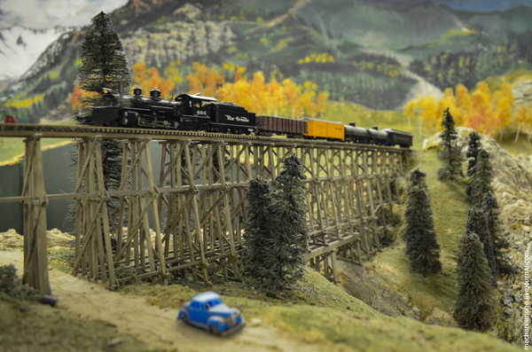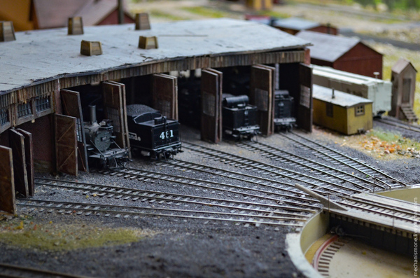Почти все декорации сделаны вручную самостоятельно, из покупного здесь лишь вагоны, материал и тепловозы с паровозами.