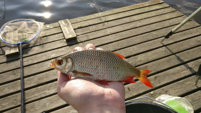 В один прекрасный момент я заметил, что у самого берега проплывает стайка красноперки и попытался поймать одну из этих красивых рыбок в приглядку, это мне удалось и принесло не мало положительных эмоций!
