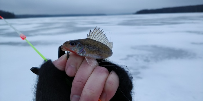 Затем последовала поклевка у Ромы, рыба размотала леску, сдернула рыбку, но на крючок не попалась. После этого где-то на час у нас было затишье в клеве. В это время мы успели поймать немного местных ершей и окуней для наживки. Ловили на мотыля, рыбки клевали очень хорошо. В прошлый выезд мы мотыля не брали, а ловили мелких окуней на небольшие балансиры. Поклевок было гораздо меньше.