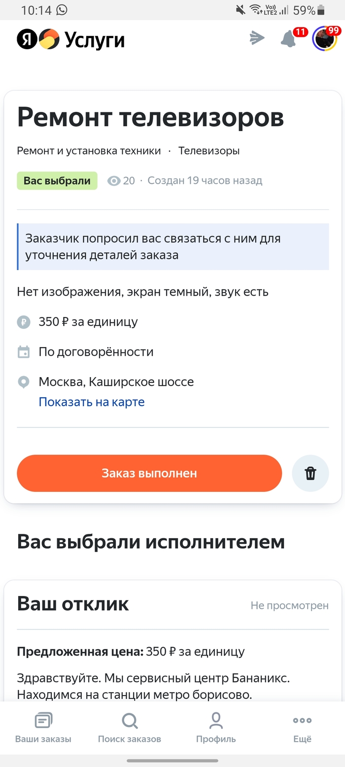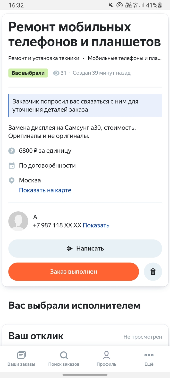 Смотрим на услугах: о как, отклик не просмотрен, но клиент выбрал именно нас.