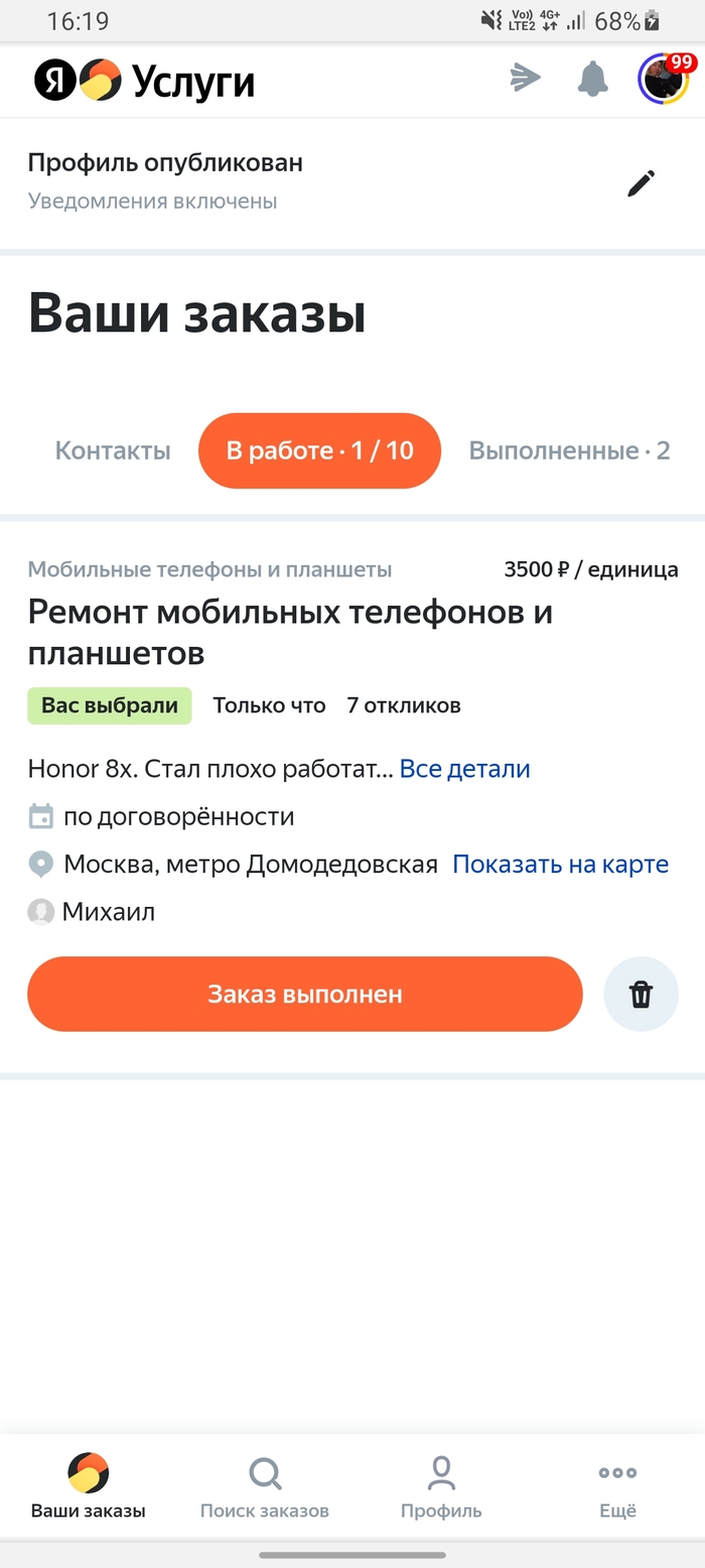 Теперь к сути: имея собственный сервисный центр, хочется иногда чуточку больше клиентов, у всех бывают застои, поэтому раньше пользовался сервисом ЮДУ, но ушёл, т.к много фейк заказов. Со временем появились ЯндексУслуги, но сразу я не пошёл туда: только спустя год решил подключить свой сервис к нему.