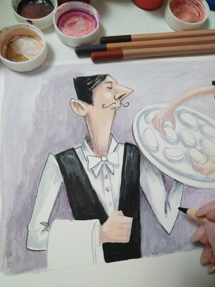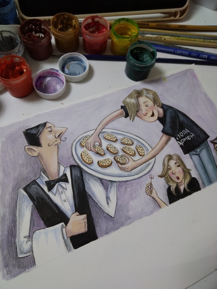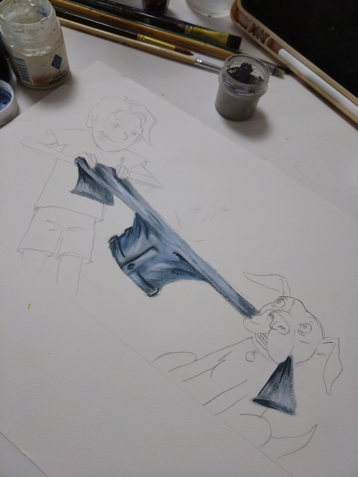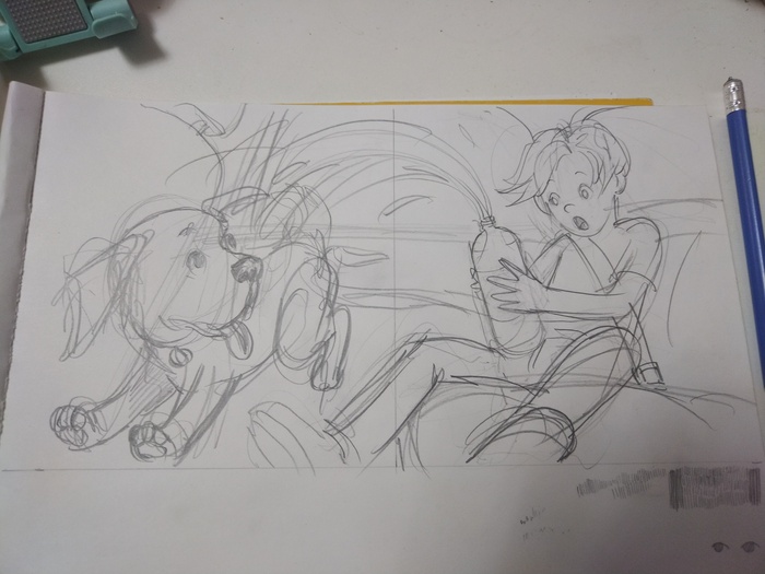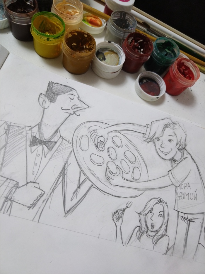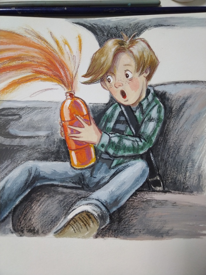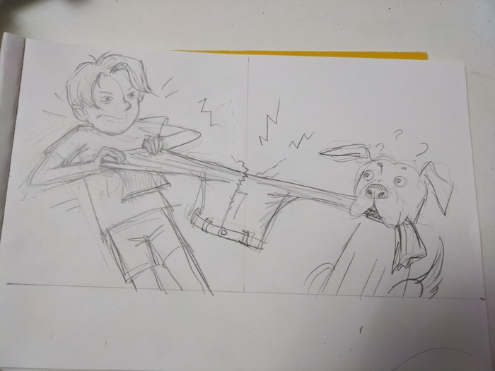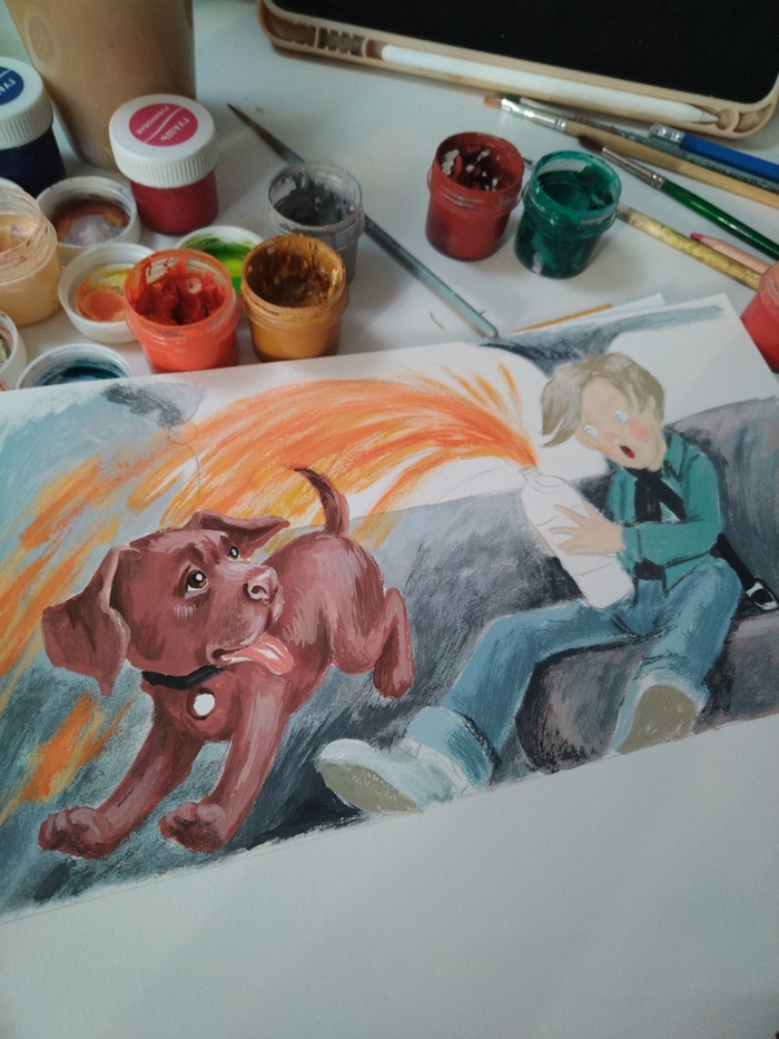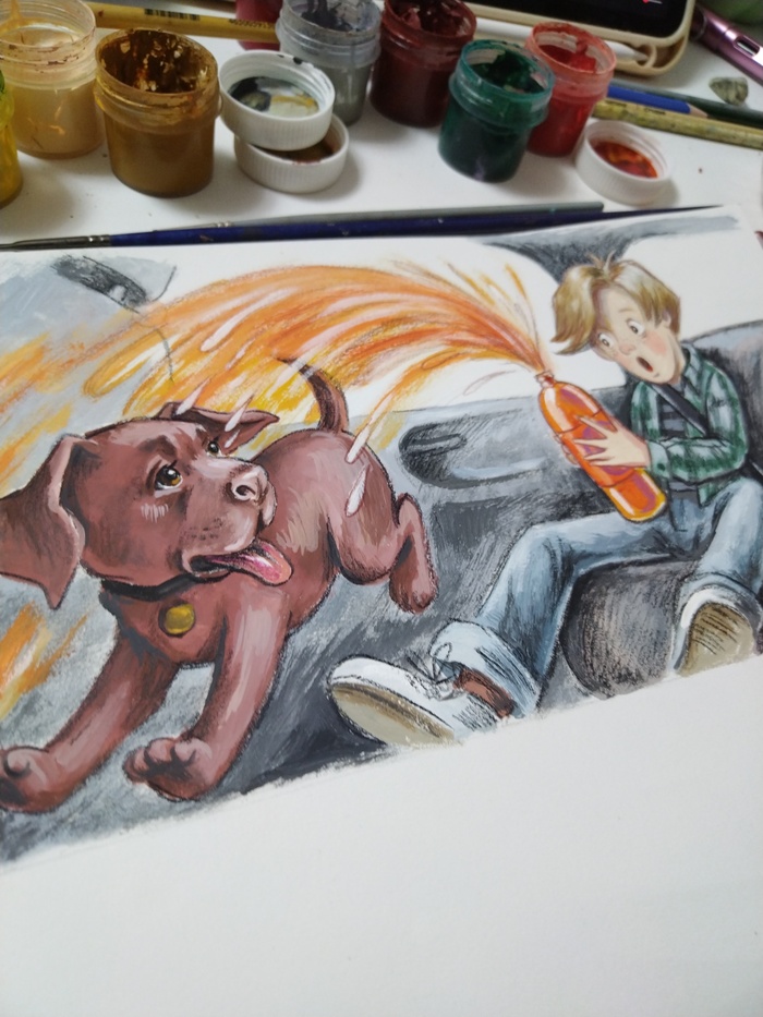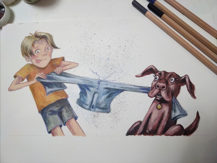 Сначала сделала несколько эскизов карандашом, в поисках динамики и композиции. Потом выбирала материалы, которые лучше всего подходили бы идее рисунка. Остановилась на гуаше, она дает интересный шершавый эффект . Карандашами дорабатываю детали. В сценке главный герой решает осовременить дизайн своих джинс с помощью собаки, она должна сделать красивые рваные дырки на них, но собака не понимает, чего от нее хотят 😅☺️