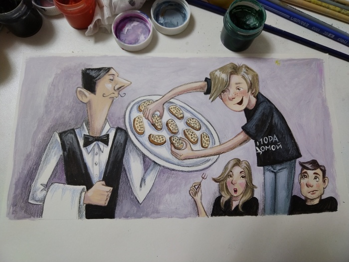 В новой иллюстрации обыгрывается, сценка в которой главный герой в дорогом ресторане набирает много бутербродов с черной икрой с подноса официанта, думая что это бесплатное угощение.