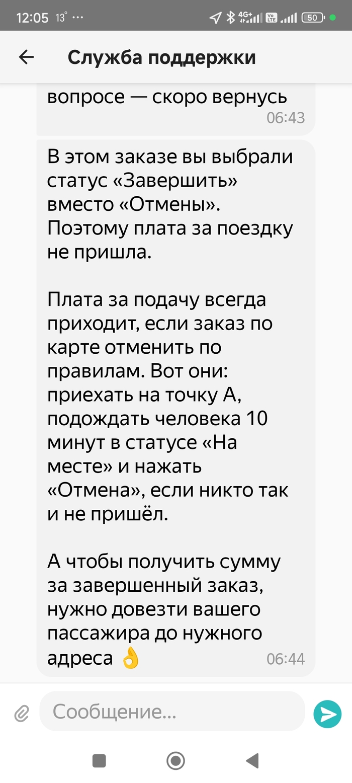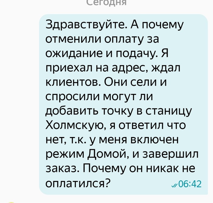Собственно, вчера возвращаясь из Армавира (заказ выполнял туда), взял заказ по режиму Домой. Приехал на точку, подождал пассажиров, пока они пришли накапало платное ожидание. Сели, нажал В путь, поехали. Но тут одной мадам подпитой (вот хуже пьяной бабы нет пассажира!!!) захотелось изменить маршрут в обратном направлении совсем. Я конечно отказался и завершил поездку, к этому моменту мы проехали полкилометра где-то. 91 рубль с барского плеча капнуло за этот заказ. Но сегодня утром я проверил зашёл в приложение (такие заказы всегда на следующий день проверяю), а там по нулям. Пишу в поддержку: