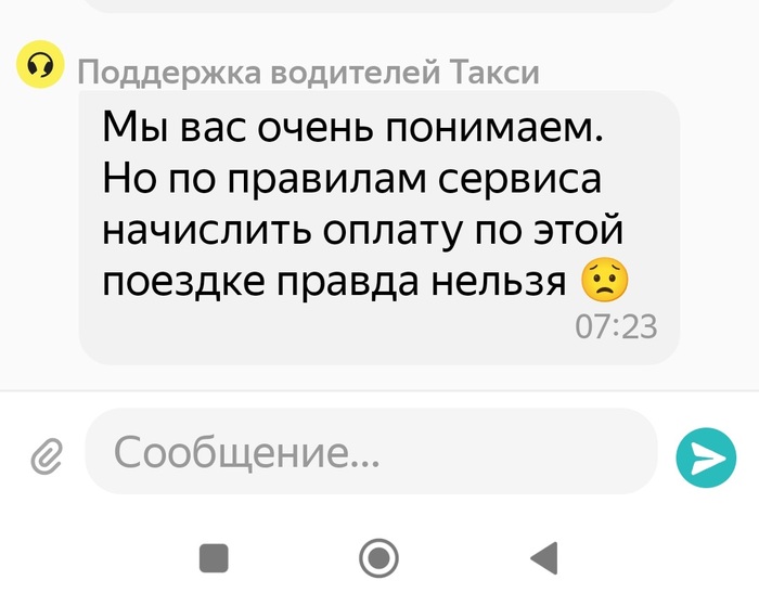 Но заказ был начат, да, пусть полкилометра я их провез, но провез.. Начал снова писать, но произошло следующее: клавиатура зависла на середине сообщения, и перестала вообще реагировать на касания. Потом мое сообщение пропало и пришёл ответ: