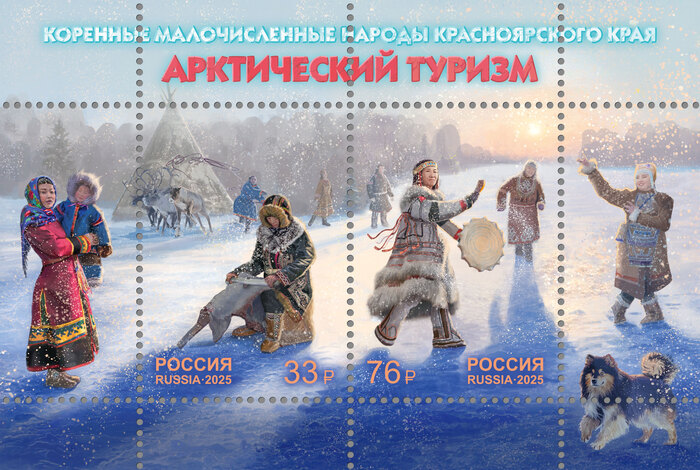 В конце прошлого года Почта России «порадовала» красочным выпуском, посвященным Арктическому туризму. В аннотации к выпуску написано следующее: «На почтовых марках и полях листа на фоне арктического пейзажа изображены представители коренных народов, проживающих в Красноярском крае, в национальных костюмах: энцы, ненцы, долганы, селькупы, кеты, нганасаны, чулымцы, эвенки».