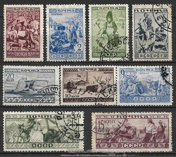 Первую, большую серию марок, посвященную народам СССР, издали в далёком 1933 году. Серия большая, я покажу только часть её. Художники, как могли, продемонстрировали особенности быта разных народов страны. Им это удалось, насколько позволяют лаконичность и размер почтовой марки.