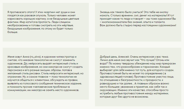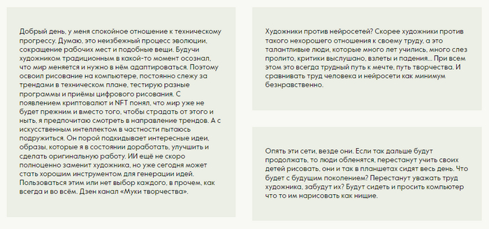 Приведя в пример скрины из пабликов про нейросети, правильно было бы опросить и художников традиционных практик. Конечно, мат и грязь из Пикабу вставлять в статью смысла нет, я сменил тактику и обратился с этим вопросом к владельцам групп о искусстве в соцсетях, каналов в Дзен, иллюстраторам и художникам. Персонально.