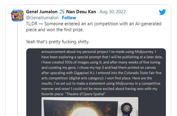 “TL; DR — Кто-то участвовал в художественном конкурсе с произведением, созданным искусственным интеллектом, и получил первый приз”, - написал художник Генель Джумалон в вирусном твите о победе Аллена. “Да, это чертовски дерьмово”.