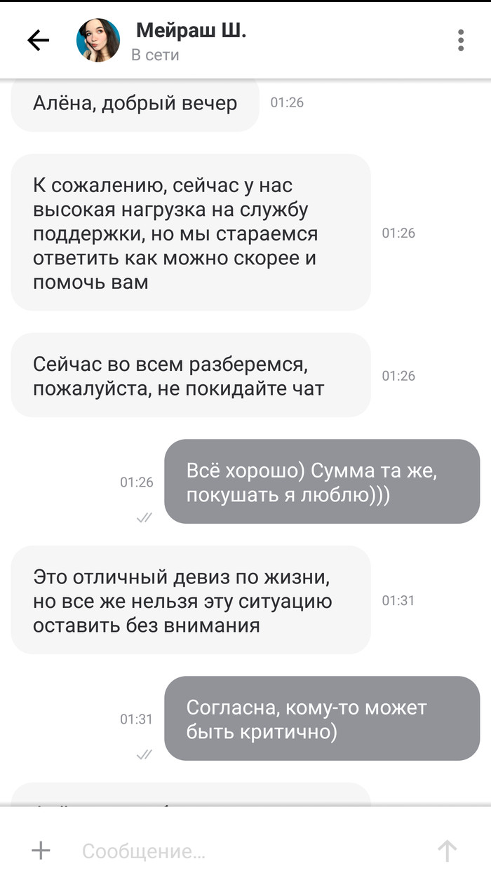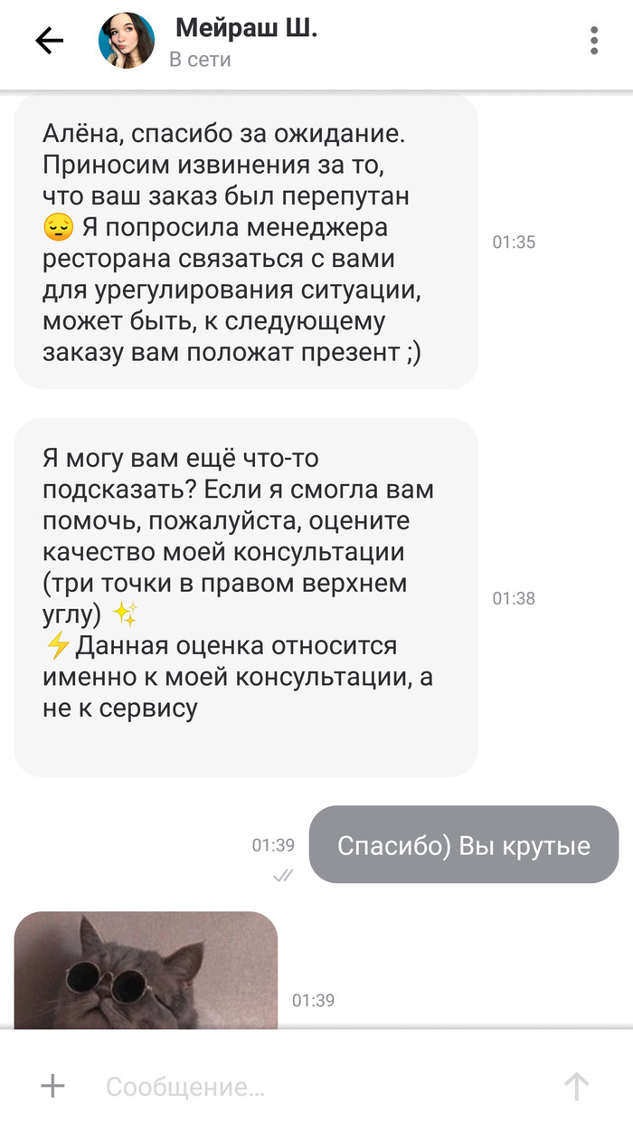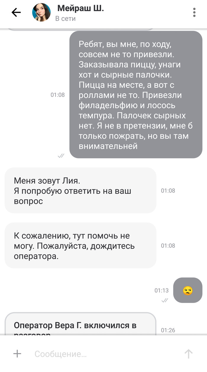 Пишем в тп, девочки отвечают, ресторан перезванивает, предлагает на выбор довезти палочки сейчас, либо к следующему заказу. Выбираю второе, потому что я уже наелась чьих-то роллов. Ну и немного хорошего от операторов Дивелири