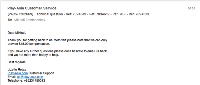 Вкратце: я потратил почти 200$ на исправление их ошибки (они мне отправили приставку с бесполезной для эмуляторов прошивкой 3.65 вместо 3.60, которую обещали). Перед этим, в переписке, обещали компенсировать всю сумму. Я им выслал документ из сервиса, с ценой замены материнской платы (единственный вариант сделать downgrade прошивки). Теперь они хотят вернуть мне только 15$. Круто, да? Буду связываться с PayPal для разрешения данной ситуации.