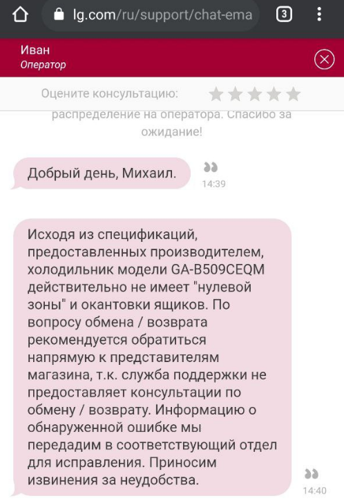 По вопросам возврата LG отправляет в Эльдорадо, а Эльдорадо берёт 3 дня на размышления. Через три дня мы снова обратились в поддержку, там сказали что вопрос уже решен, надо только подождать пока с нами свяжутся. Через день связались, да: нам написали письмо с вопросом "напишите подробнее, в чем проблема с окантовкой ящиков, пришлите фото". То есть вообще непонятно, дошла ли вся информация до ответственных лиц, или нет. Мы ещё раз всё расписали, приложили фото и скриншоты. Написали, что данная модель нам не подходит, что хотим оформить возврат т.к. товар не соответствует описанию, что использовали товар два дня, а теперь он стоит отключенный и готовый к транспортировке, написали, что упаковка не сохранилась.