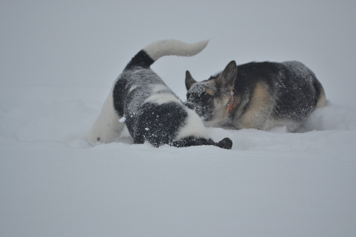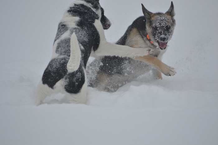 У нас Гуччи – любитель играть с щенками. Вжик и Поночка уехали по домам. И Гуччи с радостью переключился на Герду. Практически ни минуты не оставляет её без внимания. Всю прогулку они прыгают, валяются в снегу, бегают друг за другом. А ещё Герда иногда играет с Сакурой. Она совершенно не боится боксёрихи. Напрыгивает Сакуре на спину и тихонько покусывает тётку. А Сакура выворачивается и пытается прижать малышку к земле.