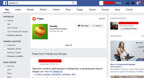 Для поиска выберите основным языком в Facebook английский. Тогда функционал для фильтрации результатов поиска будет шире. Попробуйте следующие запросы: