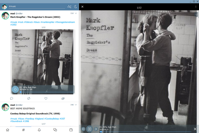- Отправка публичных и личных сообщений с медиа файлами различного формата: