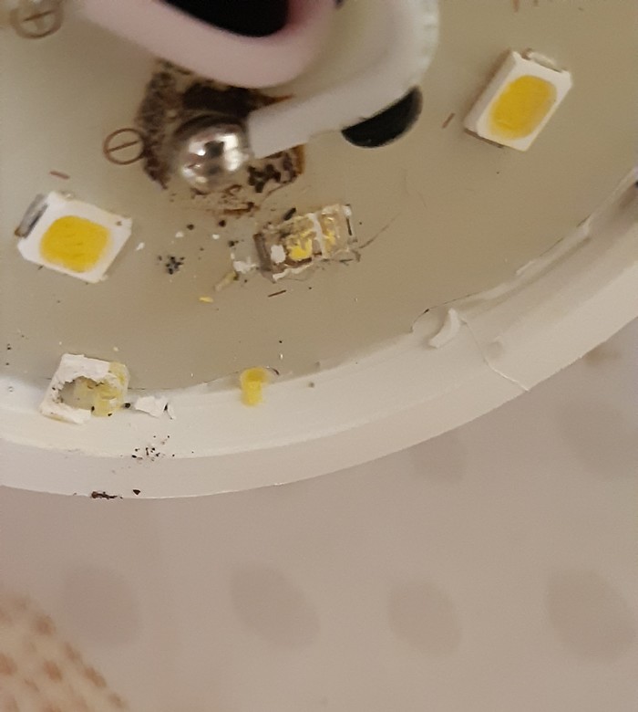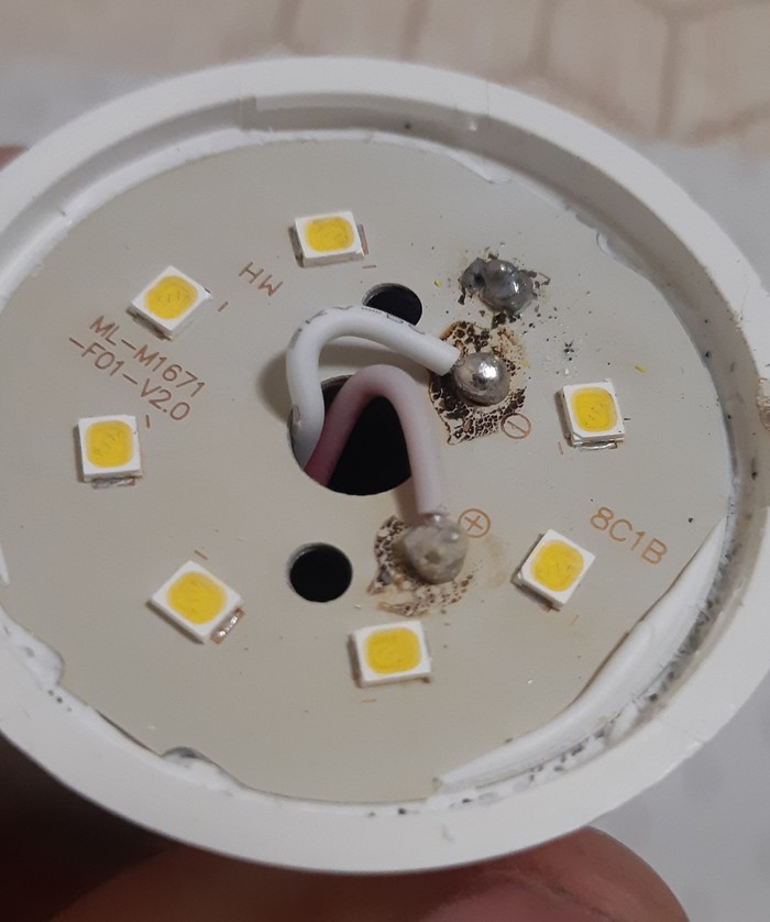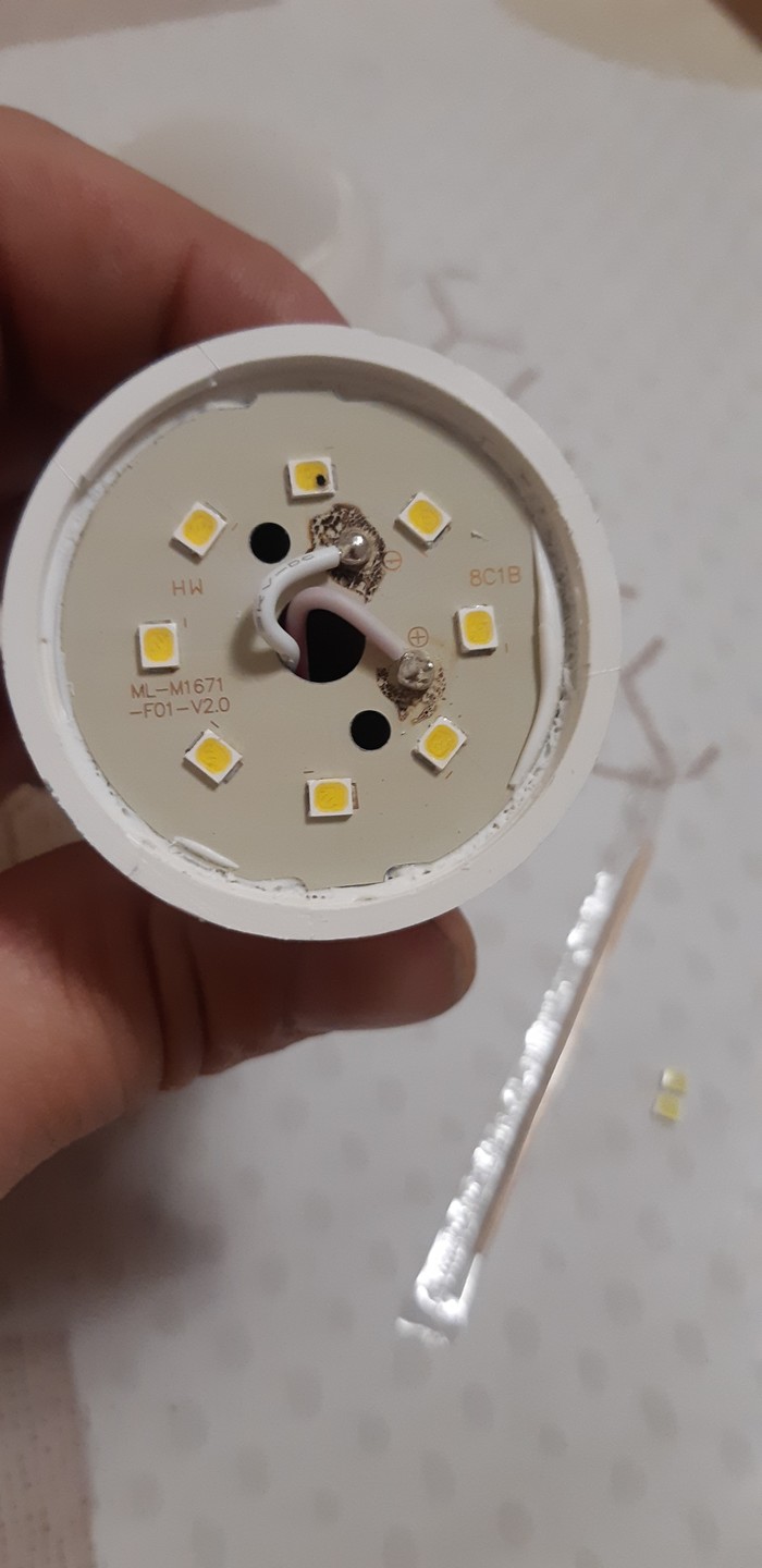 За все время покупки светодиодных ламп, я их ни разу не менял по гарантии. Пару лет прошло, перегорела, на выброс. И так всегда! Но однажды я разобрал пару штук прежде чем выкинуть и увидел перегоревшие светодиод, я подумал что хуже не будет если оторву сгоревший и запаяю место перемычкой. Результат меня удивил, лампочка ожила, и работает уже год, у меня почти все лампы пропаяны, на некоторых два, на некоторых один светодиод отсутствует. И немного фоток процесса: