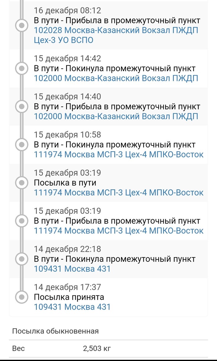 Не знаю как, но как только я собрал подарок для своего внука и отнёс на почту, вечером получил трек код подарка от своей столичной снегурочки. По трек номеру я решил побыть детективов и узнал, что посылку отправили из Жулебино (Восток Москвы), весом 2.5 кг, и почти полную фамилию снегурочки, но пару букв была скрыта. КОЖ*Р*НА. Вариантов фамилий много, поэтому можно даже не искать в соц.сетях, хотя я и расстроился, что не увижу её на фото, для меня она останется действительно "тайной"