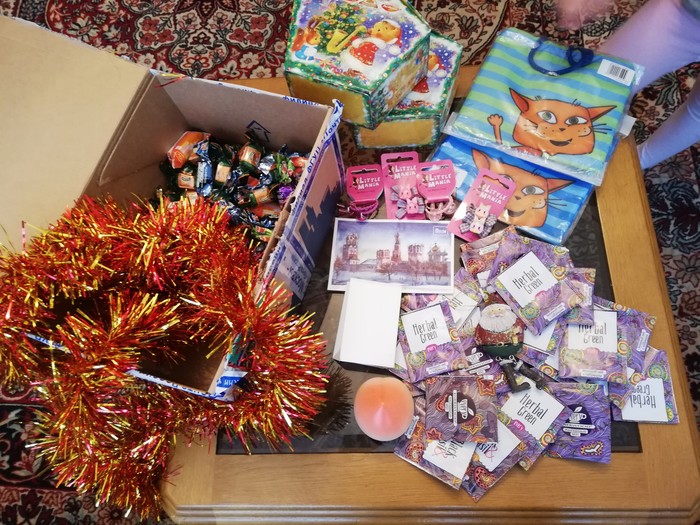 Дети в восторге. Тут и две сумки под обувь для моих спортсменок, и много вкусного чая, открыточка с кремлём, крем для рук в виде персика, само собой конфеты, но была штука, которая привела к детской драке (а дочки у меня ходят на ткехвандо, то драки между ними страшные):
