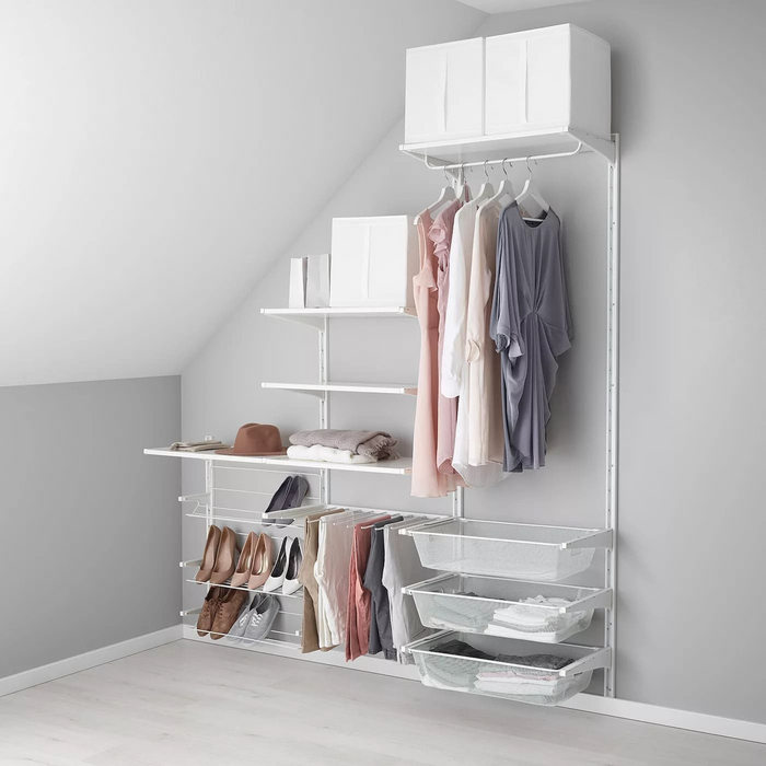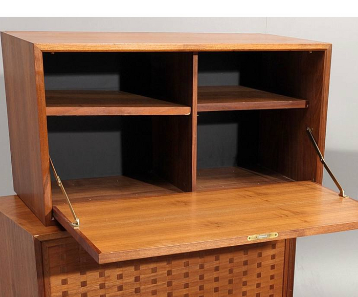 В 60х это был прорыв: множество элементов (полки, шкафы, ящики) крепятся к одной деревянной раме, их можно свободно двигать и заменять. Надоело такое расположение, захотелось чего-то новенького - поменяй полки местами или докупи новый шкафчик. Считай, Лего для домохозяек.