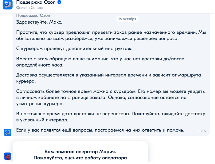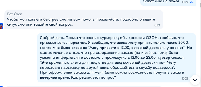 Сегодня утром (16.10.) мне приходит уведомление, что заказа передан курьеру. И в 10:21 он мне звонит и рапортует, что через час привезет заказ. На мое "Могу принять заказ после 20.00" мне было сказано: "Тогда привезу его к 13.00". Еще раз обращаю внимание, что дома никого нет и до 20.00 не будет, а так же обращение его внимания, что период доставки указан с 13.00 до 23.00, мне было сказано следующее: "Это временные слоты для нас, а не для вас; вечерней доставки нет. Могу переставить доставку на другой день, обращайтесь в службу поддержки".