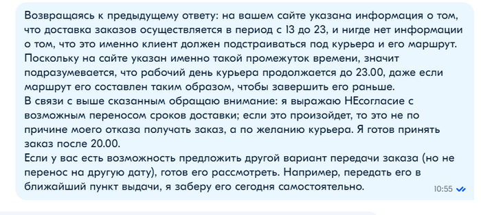 "Ля" у меня запала и зависла там надолго, поскольку мало того, что я при переписке с ТП указывал, что переносить заказ не намерен, поскольку день еще не закончился, с 20.00 я готов принять курьера; так мне еще навязывают принять решение о переносе доставки до 18.10, в противном случае просто расторгнут со мной договор купли-продажи в одностороннем порядке.
