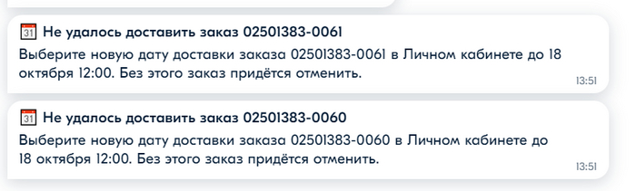 "Ну может курьер на понт брал? Понятное дело, ему тоже хочется побыстрее заказы развести, маршрут закончить и по своим делам отправиться. Вечером все же привезет заказ, куда ему деться?" - так опрометчиво подумал я. Потому что в 13:51 у меня в ЛК отображаются уведомления о том, что заказ не смогли доставить.