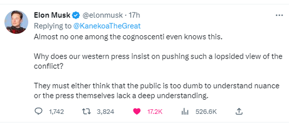 Твит в котором рассказывается, что на Украине в 19-м году оказывается начали зажимать русский язык заметил Илон Маск и написал в ответ: