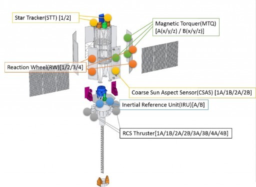 Вот как все это выглядит на Хитоми. Star Tracker — звездный датчик (2 шт). Reaction Wheel — гиродин (3 + 1шт). RCS thruster — двигатели ориентации (4 шт * 2). Magnetic torquer — магнитный привод (3 шт *2). И Coarse Sun Aspect Sensor (2 шт *2) - резервные датчики положения Солнца, на случай, если сломается все остальное.
