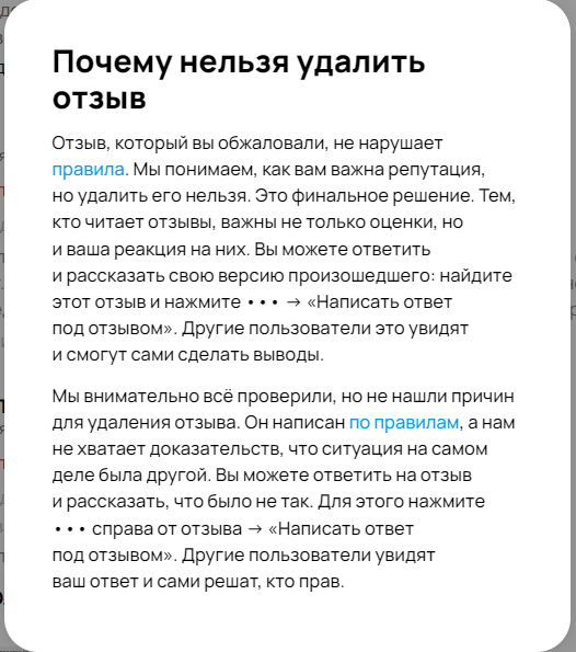 Если я правильно помню - я попытался обжаловать этот отзыв 7 раз. Каждый раз отказ приходил словно от робота, с шаблонным ответом, типа такого.