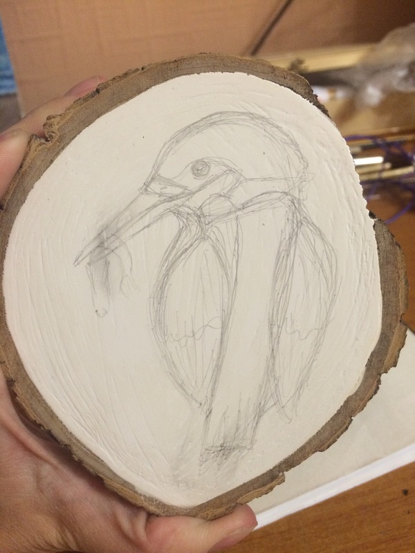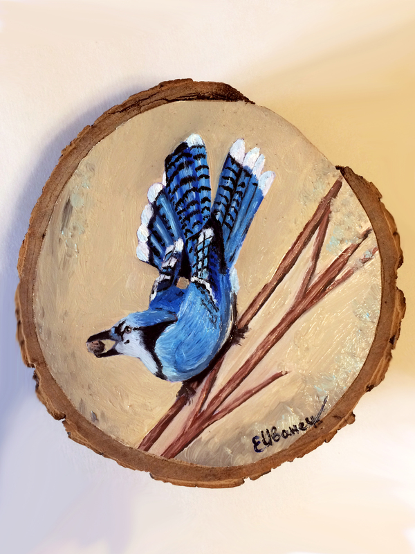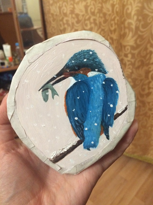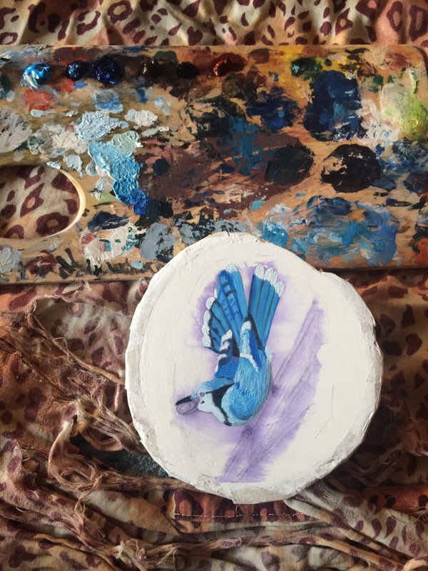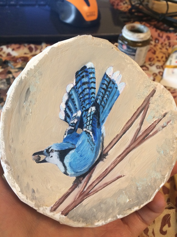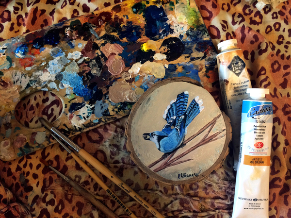 Ну и последней из-под моей кисти вылетела голубая сойка... Эта птица, к сожалению, на территории России не обитает, увидела ее однажды где-то на фотографиях в "птичем" сообществе, и она надолго поселилась в моем сердце)) Как выдалось свободное время - я снова принялась грунтовать спил и делать наброски...