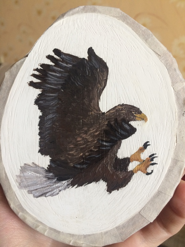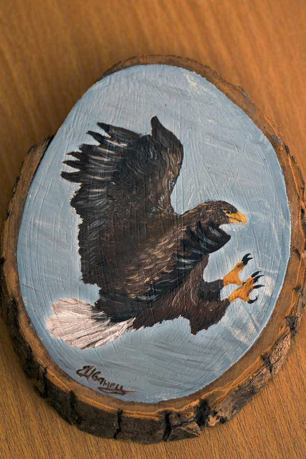 Мне пришлась по душе эта идея, и результатом я осталась довольна) Наступила зима, многие красивые птицы улетели на зимовку, однако на смену им к нам прилетели белоплечие орланы и орланы белохвосты. Очень мощные, красивые и элегантные птицы... А самое интересное, что увидеть их совсем просто - они летают практически в центре города, надо только запастись терпением и рыбкой)) В конце января в один из будних дней отправилась фотографировать их... Увиденное зрелище вдохновило меня на создание спила с орланом)