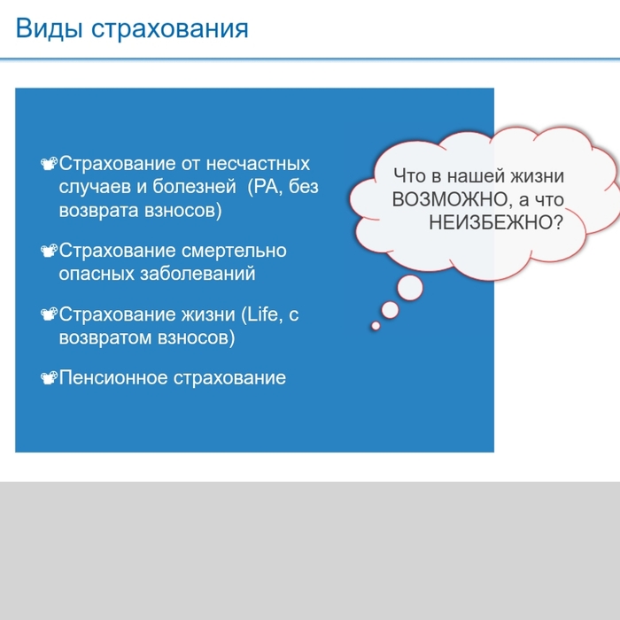 Но вернемся к страхованию, а точнее к его видам.( картинки с презентации с компании в которой я работаю, срезала название что бы не было рекламы и меня не забанили.)