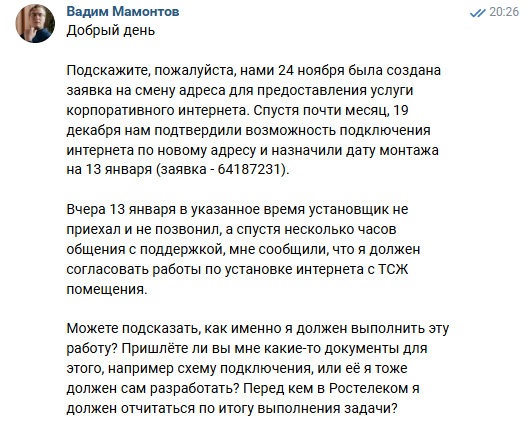 1. Сначала от Ростелекома вообще не было никакой реакции, потому что менеджер забыл запросить у нас документы для подтверждения заявки.