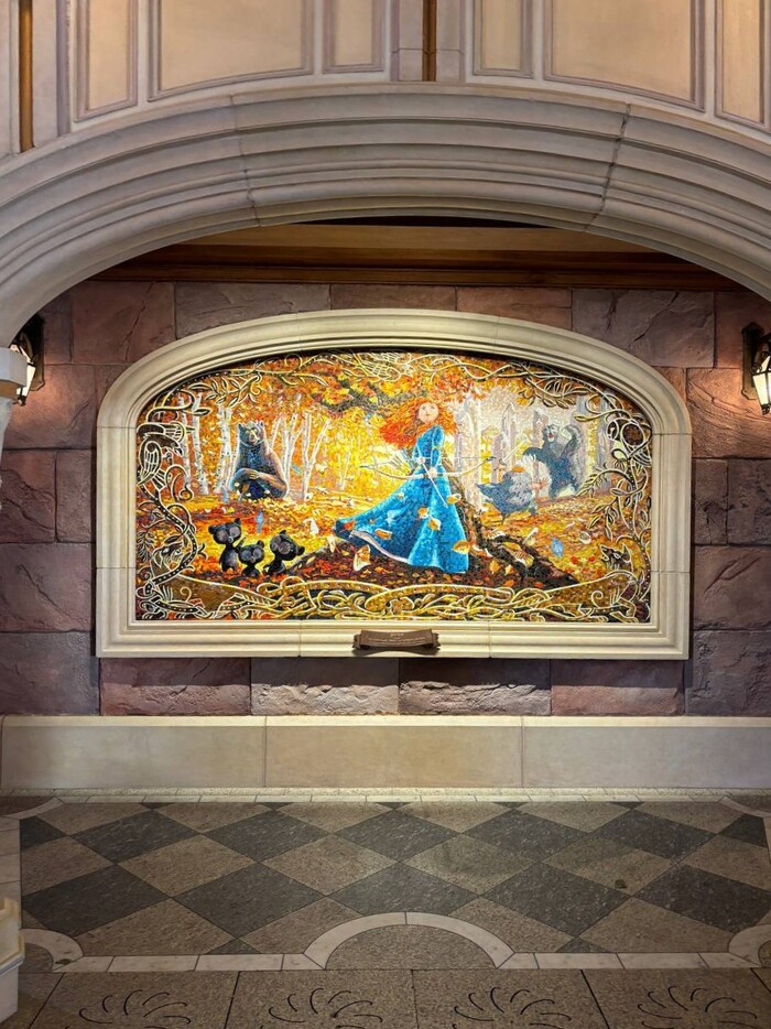 В центре-сердце парка стоит зачарованный замок старой книги, он посвящен всем принцессам диснея и является самым высоким замком среди всех парков. Внутри находятся магазины посвященные принцессам, там же проходят встречи с принцессами. В центре замка красивейшие мозаики посвященные некоторым из принцесс, больше всех из представленных мне нравится Мерида, хотя она не совсем дисней, об этом даже шутили во второй части Ральфа. Очень-очень хотелось приобрести по каноничному платью в замке, но цена очень отпугивала, получалось, около 15-30 тр. В самом замке можно посмотреть сказку про Белоснежку.