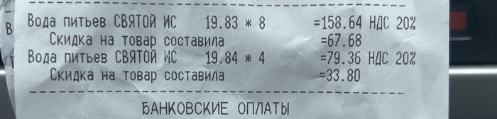 Купил сегодня упаковку воды 12 бутлок по 0,5 л, ценник 19,84 руб., т.е. 238 рублей за упаковку. Пройдя уже почти к выходу, решил глянуть в чек, и увидел следующее