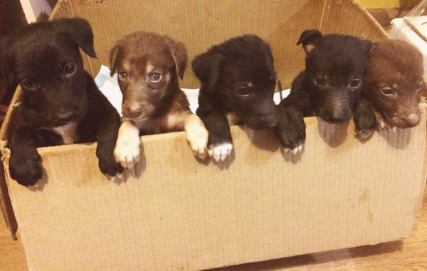 27 апреля, взяв мусор, я шла на работу. И уже подходя к помойке услышала жалобный писк. Позвонила молодому человеку-он вышел и вынес коробку. Так у нас появились псы. С самого начала собак было семеро. Осмотрев их мы пришли к выводу, что они новорожденные-пупочки висели у всех щенков и отваливаться еще не собирались. Один щенок умер через час после того, как мы забрали их домой. Еще на помойке он лежал с высунутым язычком и задыхался. Принцесса Хотдог ушла за радугу через три недели-пупочный сепсис. Осталось пятеро. Когда они все оказались девочками, мы немного пригорюнились, ведь сучки не особо в почете на пристрой, и, как мы считаем, поэтому от них и избавились. Теперь пять подросших принцесс под кодовыми именами ЖСП, Марселин, Пупырка, Зося и Жаклин ищут своих человеков. (Собаки активные, поэтому фото только такие. Как успели поймать, так и сняли.)