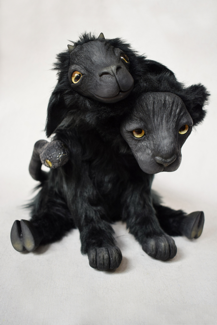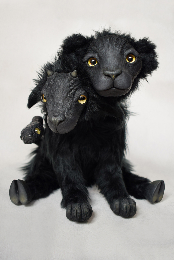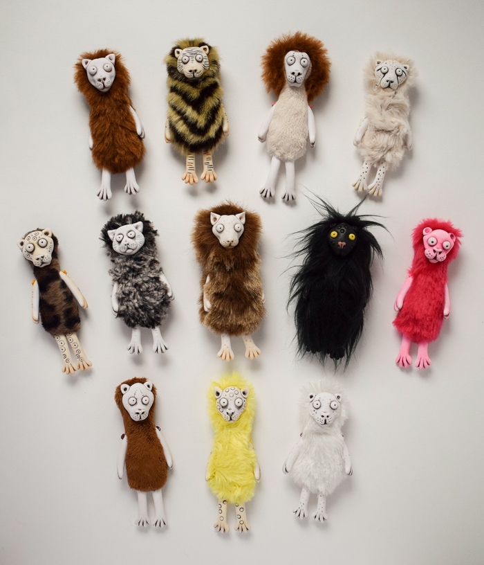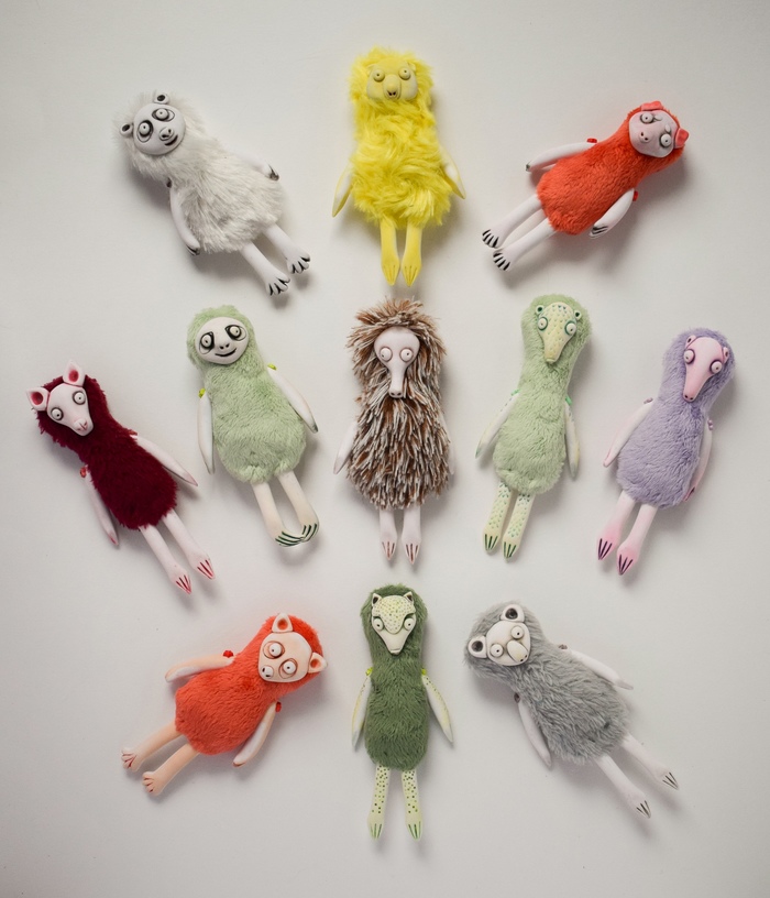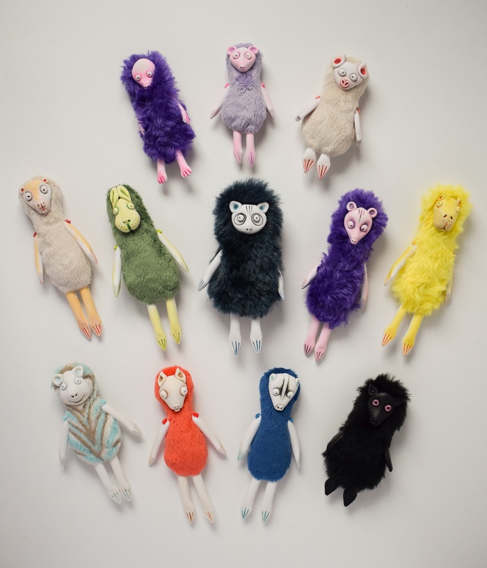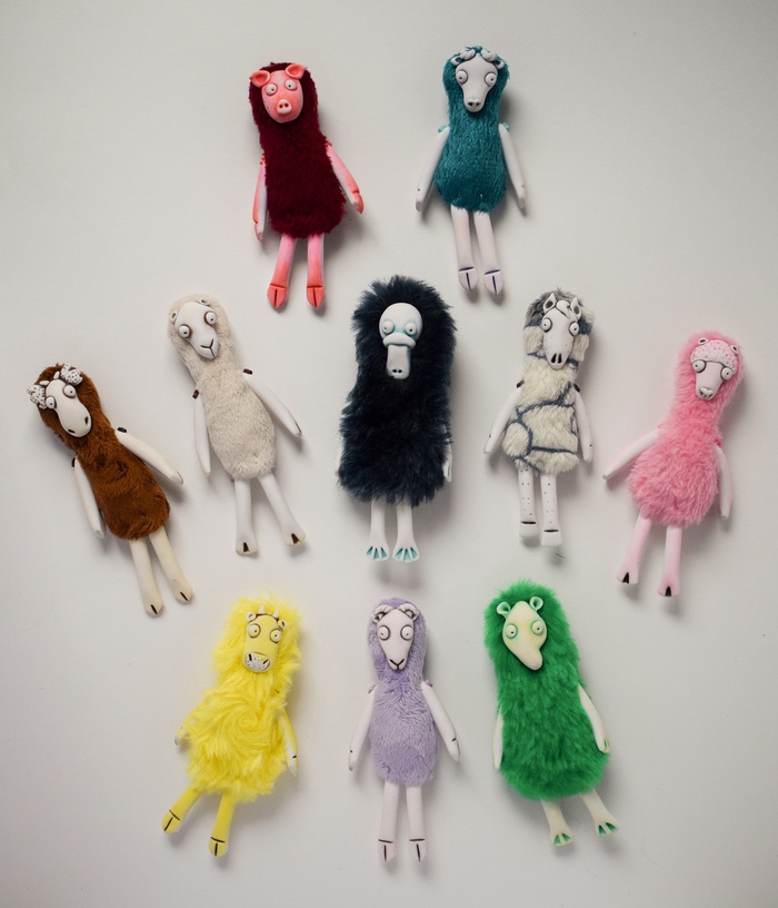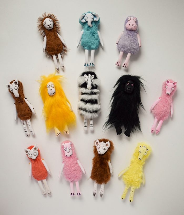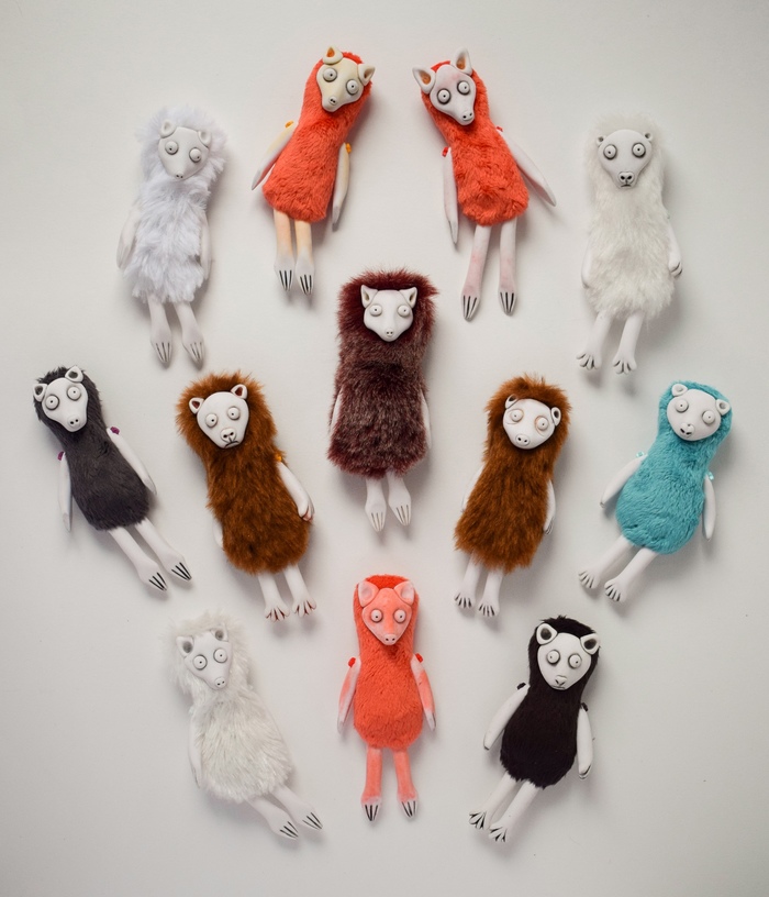 Мордашки, лапки, копытки, крылья - полимерная глина, шубки - искусственный мех, глазки - стекло.