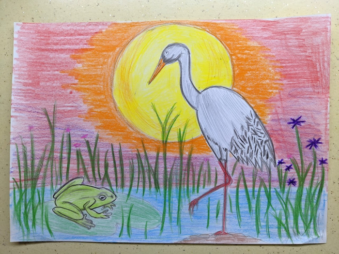 Ниже его вариант и мой. Тема - Журавль и лягушка.