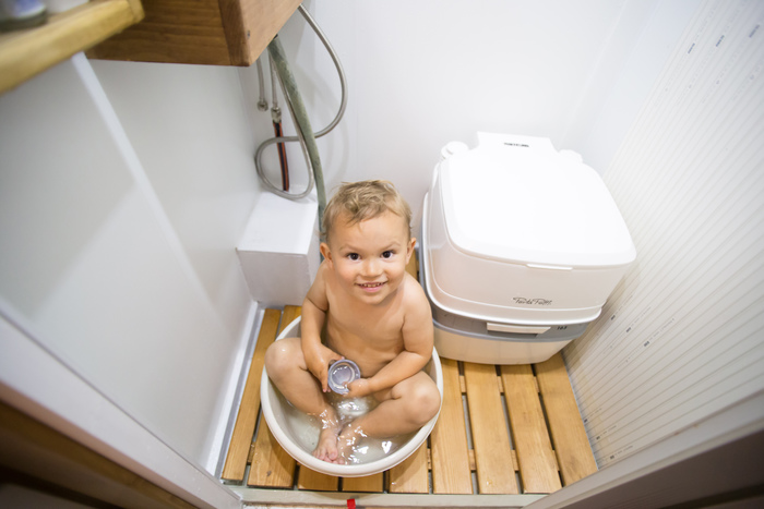 Сам биотуалет слегка пахнет химией, но не напрягает. В туалете у нас установлен вентилятор, так что посторонних запахов нет (но когда моешься в душе, он может предательские подуть в спину из-за сквозняка). Для любителей пикантных подробностей: звукоизоляция плохая, так что один из нас просто выходит на улицу.