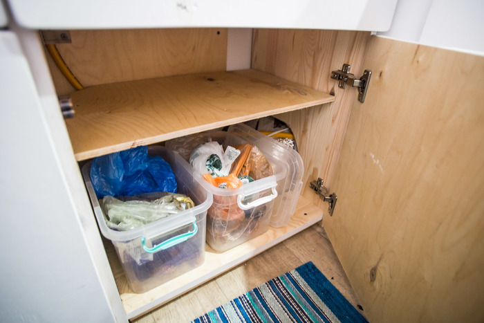 Для мытья посуды, стирки, да и вообще для мытья почти всего (кроме волос)), мы используем мыло и очень редко средство для мытья посуды (для сильных загрязнений). Мы к этому как-то привыкли с предыдущих путешествий. Очень быстро загрязняется пол, потому что не всегда удобно снимать обувь-подметаем очень часто. Мусорное ведро прикреплено за водительским сиденьем. Перед входом у нас два коврика, чтобы вытирать ноги.
