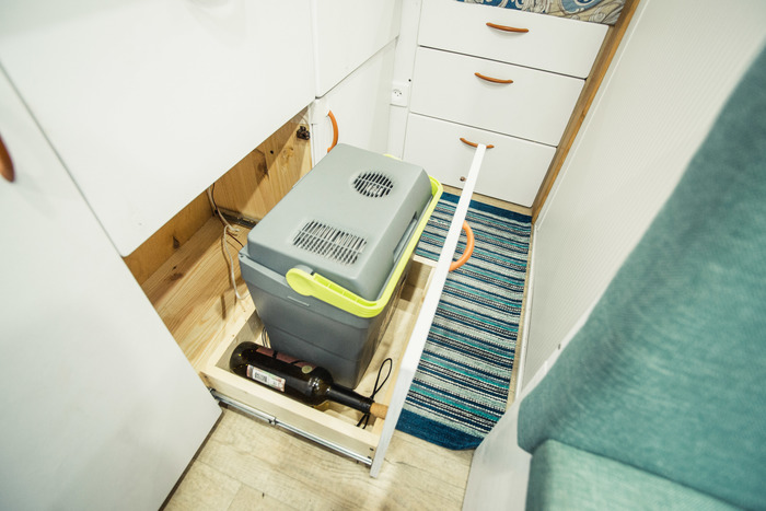 Полку для обуви мы еще не сделали, так что она просто хранится у входа (обуви тоже мало, я проносила почти всю поездку 1 кроссовки). Запасная обувь (треккинговые ботинки, босоножки,шлепки) так же хранится в полке над передними сиденьями.