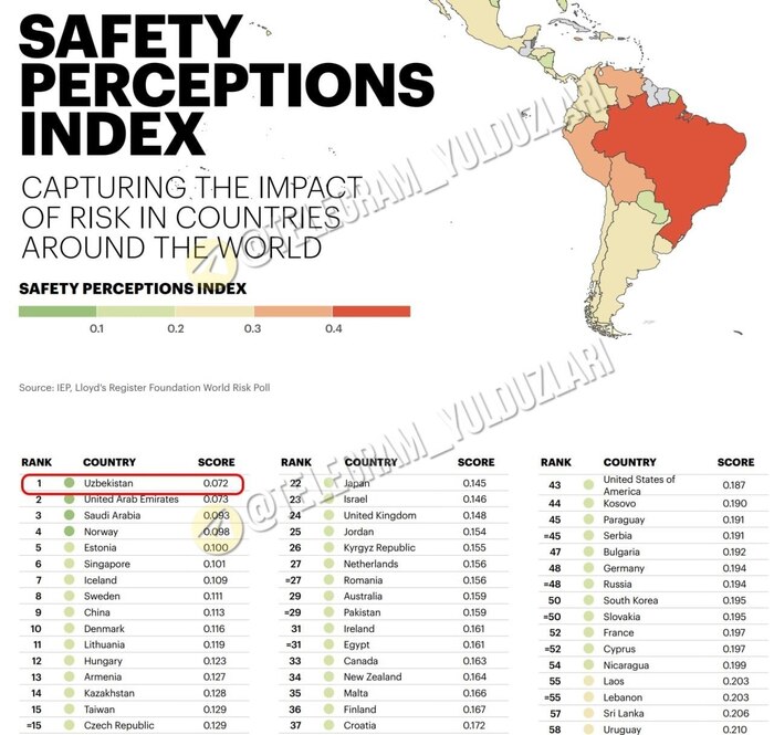 Раз пошла такая волна, то переезжайте к нам в Узбекистан. У нас тут не блокируют Ютуб и Инстаграм, только тикток! Здесь очень безопасно, первое место в мире, вот статистика: