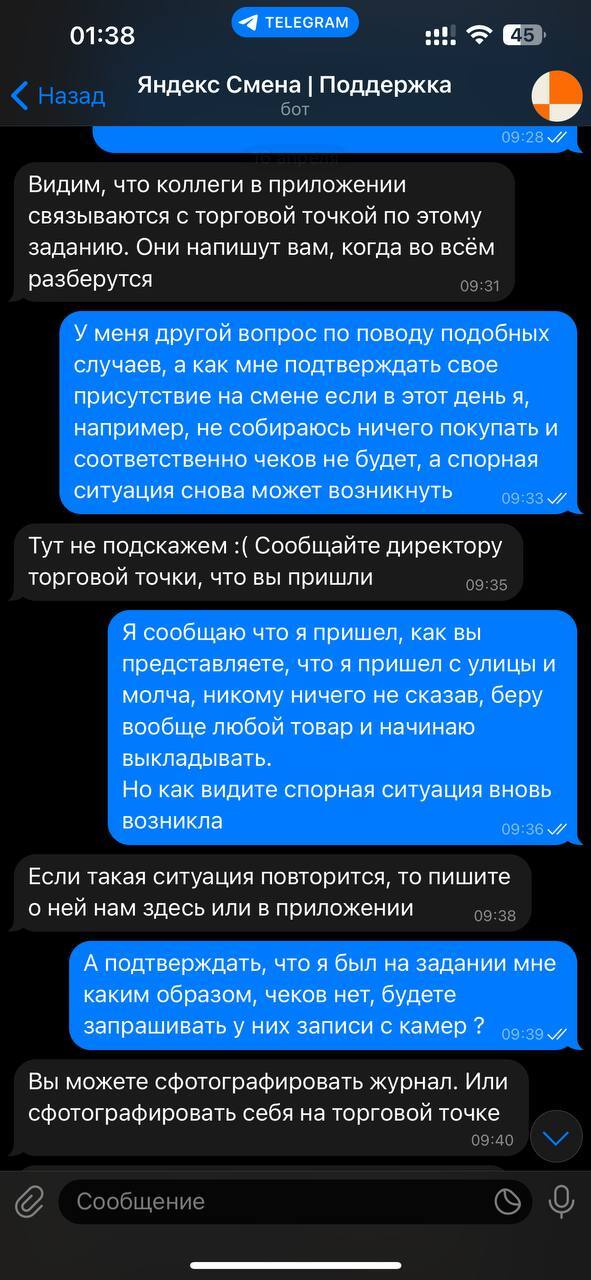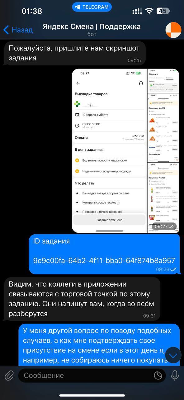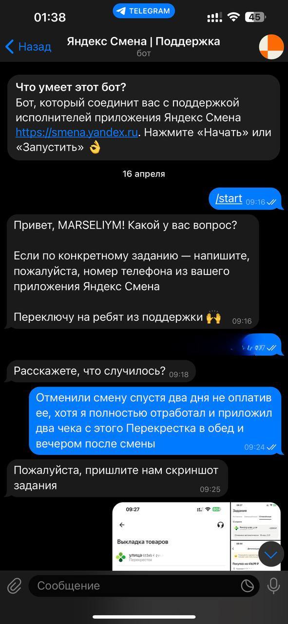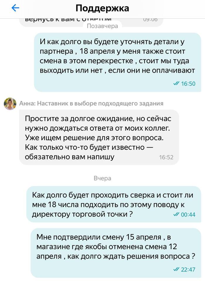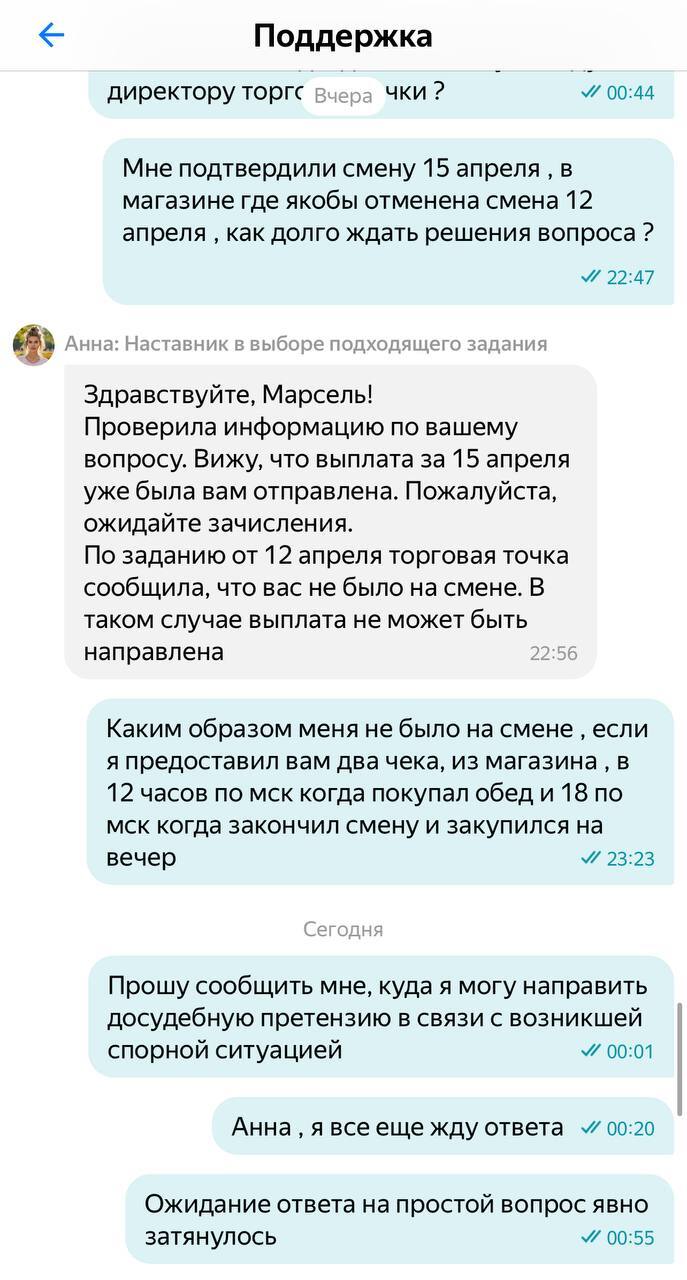 3. Далее наступает утро 16 апреля, я захожу в приложение и вижу, что в 2.21 ночи мое задание от 12 апреля из статуса активного перешло в статус "Отменено автоматически 16 апр, 2:21", я естественно сразу же написал в поддержку и попросил разобраться в данном вопросе, предоставив им два чека из приложения как подтверждение моего присутствия на торговой точке, они пообещали разобраться во всем, а меня отправили ждать, поскольку этот процесс не быстрый, видимо после того как я начал их хоть немного тормошить, они соизволили закрыть мне смену от 15 апреля и выплата за нее мне пришла 17 апреля в 7.56 утра, но вопрос со сменой от 12 апреля все еще оставался открытым, вечером я решил связаться с техподдержкой и уточнить, как идет решение возникшей ситуации, на что мне ответили, что за смену 15 апреля мне уже выплатили, а по поводу 12 апреля, а какая выплата, в торговой точке сказали, что оказывается меня не было на задании, собственно вот так на данный момент выглядит моя переписка с поддержкой Яндекс.Смены в приложении: