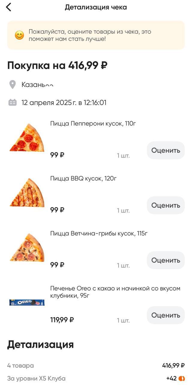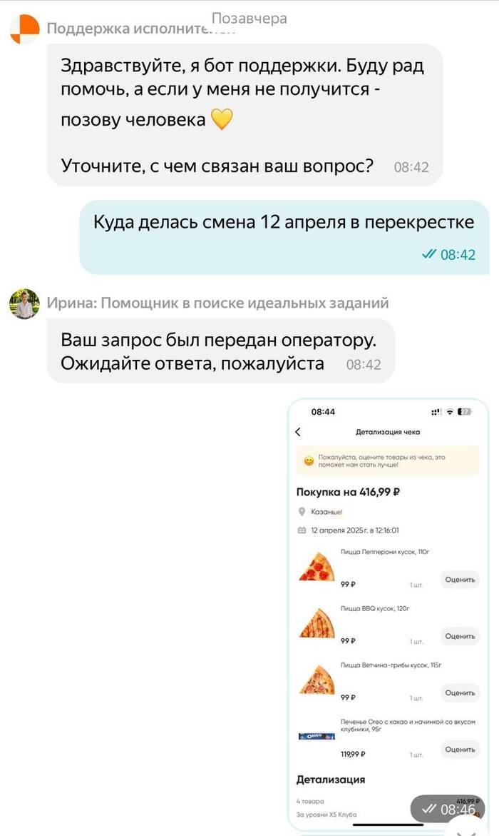 На 12 апреля 2025 года у меня стояла смена по выкладке товаров в торговой сети Перекресток, с 9 до 18, стандартные 8 часов работы и 1 час перерыва, на данную точку я выходил до этого уже дважды и ничего не предвещало беды, я спокойно пришел на задание, сообщил директору о своем приходе, получил от нее направление на отдел, переоделся и приступил к выполнению задания. Меня направили на выкладку в отдел с напитками со словами "Вода, пиво, соки, все что нужно из этого, все выставляй", поработав 3 часа я решил воспользоваться правом на обеденный перерыв, приобрел в торговом зале товар на кассе, применив свою карту Перекрестка, чтобы сохранить чек и отправился обедать. В подтверждение прикладываю чек о покупке из приложения Перекресток, с замазанным адресом, техническая поддержка Яндекс.Смены естественно получила оригинальный скриншот на котором виден адрес торговой точки.
